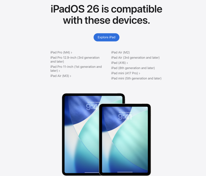 iPad Pro M4、iPad Pro 11 英寸(第一代和后续版本)、iPad Pro 12.9 英寸(第三代和后续版本)、iPad Air M2、iPad Air M3、iPad Air(第三代和后续版本)、iPad(A16)、iPad(第八代和后续版本)、iPad mini(A17 Pro)、iPad mini(第五代和后续版本)。