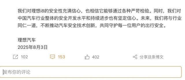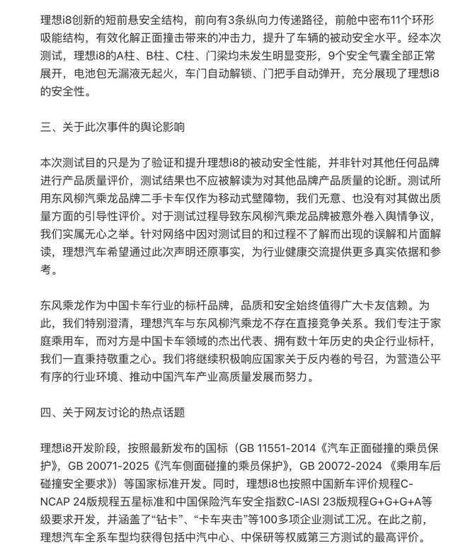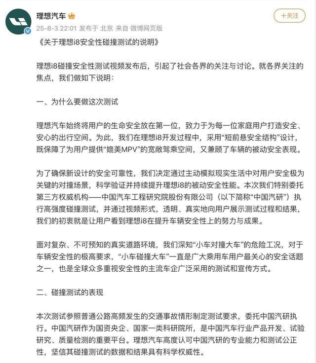 8月3日晚间,理想汽车微博发布《关于理想i8安全性碰撞测试的说明》,其中提到:
