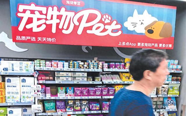 今年以来,宠物经济展现出强劲的发展势头,消费数据屡创新高。图为消费者在某超市的宠物用品专区前经过。
