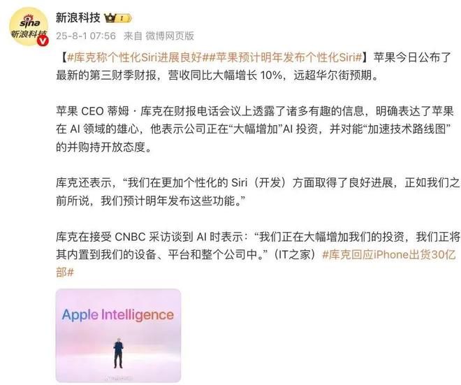 库克还表示,“我们在更加个性化的 Siri(开发)方面取得了良好进展,正如我们之前所说,我们预计明年发布这些功能。”