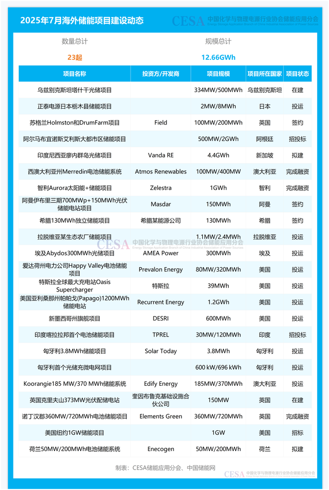 2025年7月,CESA储能应用分会产业数据库追踪到23起海外储能项目建设动态事件,总规模为12.66GWh,涉及Vanda RE、Atmos Renewables、Zelestra、Masdar、AMEA Power、Prevalon Energy、Recurrent Energy、DESRI、TPREL、Edify Energy、Elements Green、Enecogen等全球能源投资方/开发商,建设地点位于澳大利亚、荷兰、拉脱维亚、美国、日本、乌兹别克斯坦、希腊、新加坡、匈牙利、印度、英国、智利等国家。