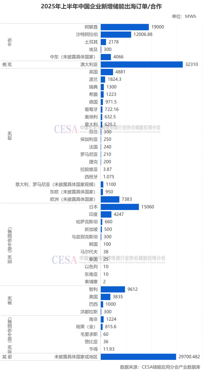 据CESA储能应用分会产业数据库不完全统计,2025年上半年,中国企业新获199个海外储能订单,总规模160.22GWh,同比+220.28%,其中中东37.55GWh,澳大利亚32.31GWh,欧洲22.81GWh,三大市场订单体量均已经超越美国,成为中国企业出海的主要目的地。