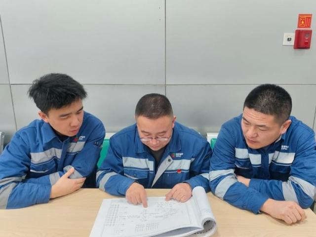 吉电股份松花江热电公司魏化雷(中间)和小组成员讨论4号炉制氮系统QC改造项目方案