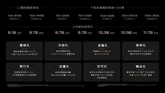 智能驾驶辅助方面,该车首发搭载千里浩瀚辅助驾驶H3方案,支持HNOA高速领航驾驶辅助、全场景泊车、AES自动紧急避让等功能。