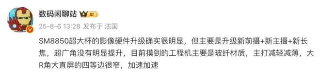 博主@数码闲聊站 此前爆料中提到,“SM8850超大杯的影像硬件升级确实很明显,但主要是升级新前摄+新主摄+新长焦,超广角没有明显提升,目前摸到的工程机主要是玻纤材质,主打减轻减薄,大R角大直屏的四等边很窄”。