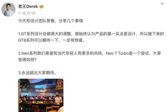 另外,王伟还表示,“Neo系列我们希望和当代年轻人有更多的共鸣,Neo 7 Turbo是一个尝试,大家觉得如何?”