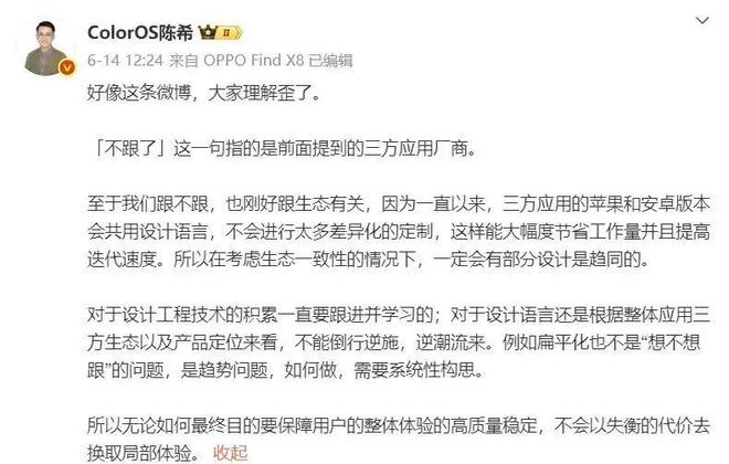 据此前报道,陈希曾发文表示不会跟进 iOS 26 设计,并解释称「不跟了」这一句指的是提到的三方应用厂商。