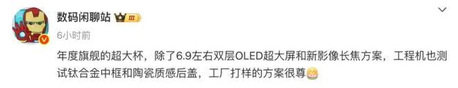 今天,博主@数码闲聊站 的一份爆料中提到,“年度旗舰的超大杯,除了6.9左右双层OLED超大屏和新影像长焦方案,工程机也测试钛合金中框和陶瓷质感后盖”。