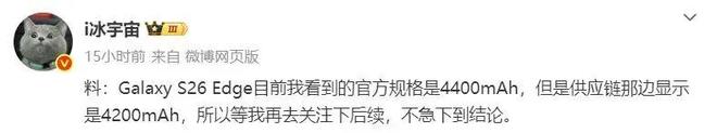 据博主 @i 冰宇宙 发文透露,目前看到的官方规格是 4400mAh ,但是供应链那边显示是 4200mAh 。