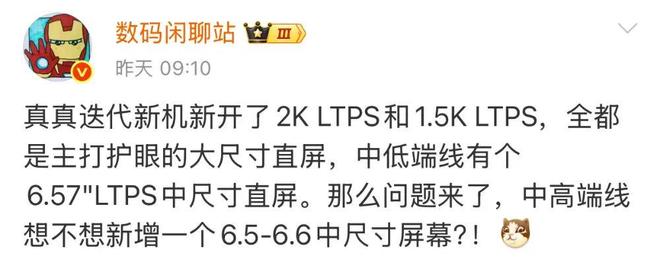 该博主同时发文透露, “ 真真迭代新机新开了 2K LTPS 和 1.5K LTPS ,全都是主打护眼的大尺寸直屏,中低端线有个 6.57"LTPS 中尺寸直屏。那么问题来了,中高端线想不想新增一个 6.5-6.6 中尺寸屏幕?! ”