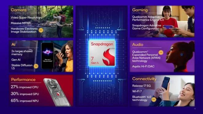 此外, AI 成为骁龙 7 Gen4 的核心亮点,平台整体 AI 性能提升 65% ,首次在骁龙 7 系支持 Stable Diffusion 1.5 模型,用户可数秒内生成图像;终端侧 AI 助手实现实时响应,且隐私性更优。