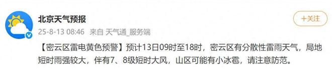 北京密云区发布雷电黄色预警 访客 2025-08-13 13:00:50 37844 默认 预计13日09时至18时,密云区有分散性雷雨天气,局地短时雨强较大,伴有7、8级短时大风,山区可能有小冰雹,请注意防范。 标签: 密云 分散性 文章版权及转载声明 作者:访客本文地址:https://nnobu.com/nnobu/1855.html发布于 2025-08-13 13:00:50文章转载或复制请以超链接形式并注明出处新华能源网 打赏 觉得文章有用就打赏一下文章作者 支付宝扫一扫打赏 微信扫一扫打赏 海报 阅读 QQ 分享 微博分享 微信分享 分享 上一篇“英特尔大戏”折射美国芯片业焦虑 下一篇“立邦”创始人吴清亮逝世, 生前为新加坡首富、为潮汕家乡捐建上亿设施 “英特尔大戏”折射美国芯片业焦虑上一篇 “立邦”创始人吴清亮逝世, 生前为新加坡首富、为潮汕家乡捐建上亿设施下一篇 相关推荐 密云分散性 美国政府正式关门,黑天鹅事件及其影响 2025-10-02 爱玛科技子公司广东车业调整产能布局,停产并转移至广西与重庆,剩余资产寻求出售 2025-10-02 哈马斯可能接受特朗普的有条件的20点计划 2025-10-02 路桥信息财报大幅变脸,2024年净利润预期大幅下调超八成,监管机构揭示内控存重大缺陷 2025-10-02 台风麦德姆生成,预计影响我国时间揭晓 2025-10-02 车企抢滩金九银十,新车频发,半个月内49品牌推出新款车型,平均每日五款新车亮相! 2025-10-02 王健林决策反转,万达广场出售加速化债之路的闪电行动与限高取消风波 2025-10-02 中转机票价格差异大,能否薅羊毛? 2025-10-02