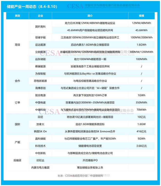 项目方面,立新能源新疆和田300MW/1200MWh构网型独立储能将并网;领储宇能江苏南京100MW/200MWh独立储能电站项目开工;国轩高科45.6MWh用户侧储能电站项目顺利并网;运达能源启动内蒙古1.6GWh独立储能项目;蜂巢能源安徽淮南首个工商业储能项目并网。