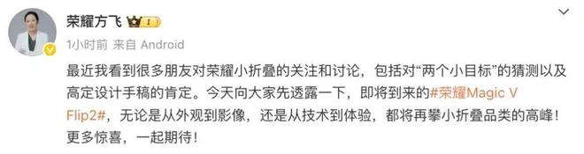 最近我看到很多朋友对荣耀小折叠的关注和讨论,包括对“两个小目标”的猜测以及高定设计手稿的肯定。今天向大家先透露一下,即将到来的荣耀Magic V Flip2,无论是从外观到影像,还是从技术到体验,都将再攀小折叠品类的高峰!更多惊喜,一起期待!
