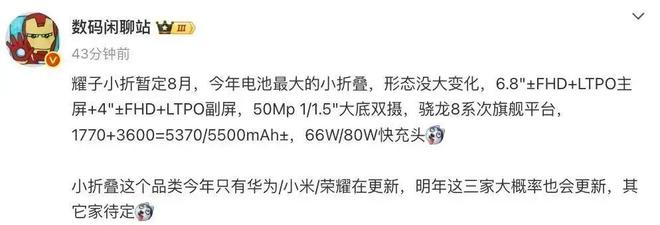 配备6.8英寸左右的FHD+LTPO主屏,结合4英寸左右的FHD+LTPO副屏,搭载骁龙8系次旗舰平台(预计为第四代骁龙8s)。