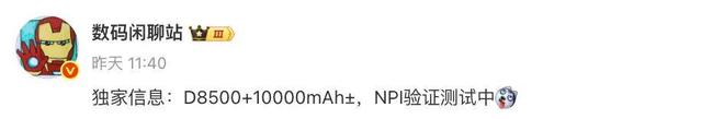 除了折叠屏新机外,博主 @数码闲聊站 最近的一份爆料中提到,某款新机将搭载天玑 8500 处理器和 10000mAh 电池。