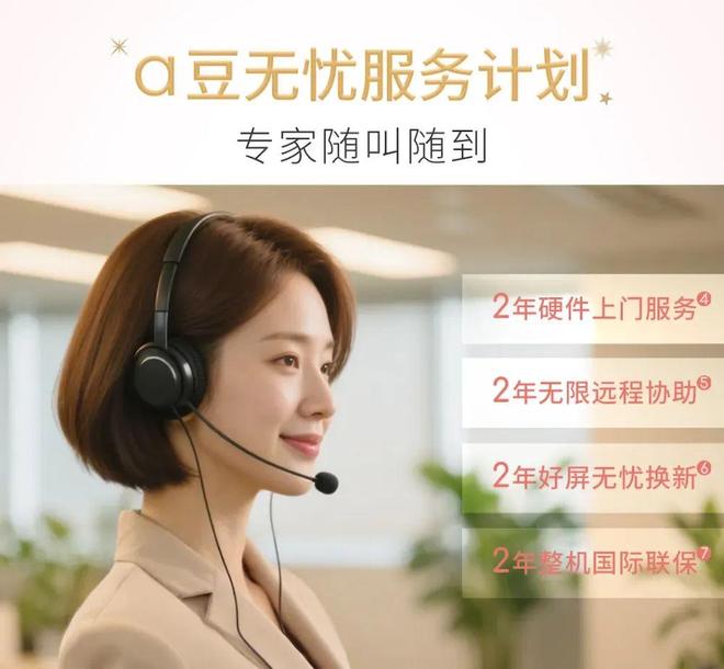 购机可享a豆无忧服务计划,包含2年硬件专家上门服务、2年无限远程协助、2年好屏无忧换新、2年整机国际联保。