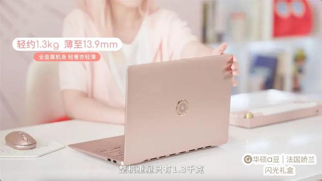 华硕a豆14 Air 香氛版整机重1.3kg、厚13.9mm,搭配「瑰蜜粉金」配色。