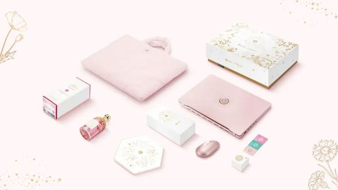 礼盒内含定制华硕a豆14 Air 香氛版、法国娇兰奇迹花园淡香水、定制云朵电脑包、定制无线鼠标、六边形星芒鼠标垫及三款香片,并可选配华硕a豆香氛机械键盘。