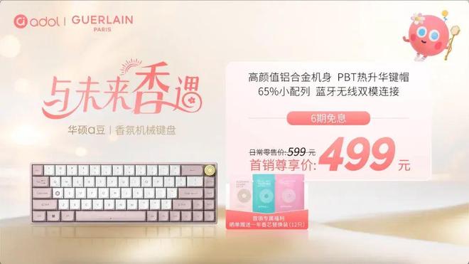可选配华硕a豆香氛机械键盘,奇迹花园配色日常价599元,首发499元,鸢尾紫、茉莉绿配色日常价499元,首发399元,晒单赠一年香芯替换装(12只)。