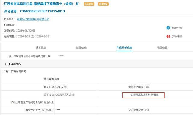 时代周报还注意到,宜春时代(持股30%)与江西永兴特钢新能源科技有限公司共同间接控股的宜丰县花桥乡白市化山瓷石矿、宜春时代(持股30%)与江西九岭锂业股份有限公司共同控股的花桥大港瓷土矿目前登记的实际开采矿种亦为陶瓷土,后者采矿证有效期至2029年12月24日。