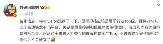 另外,参考博主@数码闲聊站 的爆料来看,“vivo Vision浅摸了一下,显示规格应该是属于行业Top级,硬件这块儿上了高通骁龙4nm平台,关键是重量控制和佩戴体验做得很好,交互和内容的目标是对标苹果,阿蓝对于未来人机交互的理解也是国产Top”。