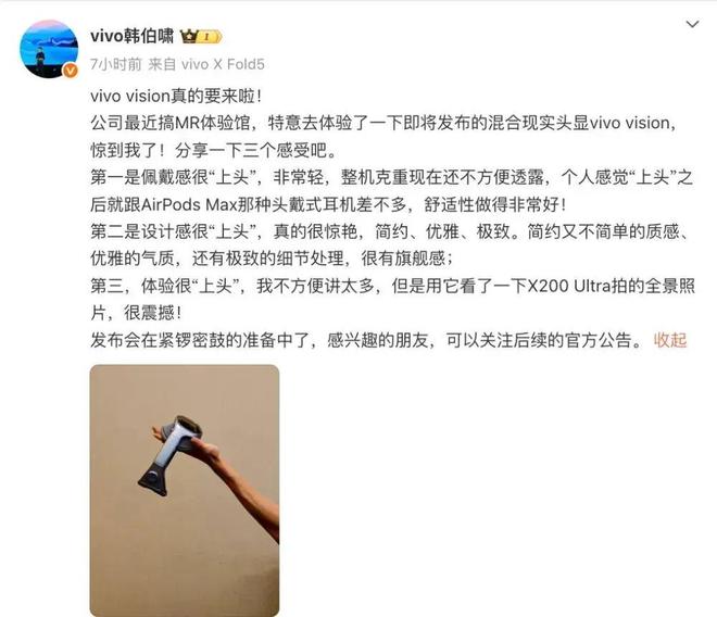 此前,vivo通信科技有限公司产品经理韩伯啸曾预热称,vivo Vision整机重量控制得很好、外观设计简约优雅、体验也十分不错。
