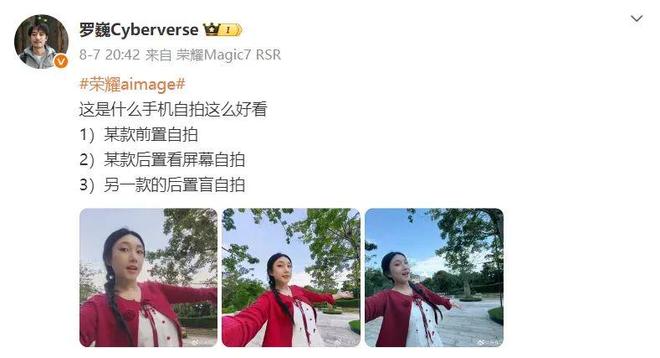此前,荣耀首席影像工程师罗巍 Cyberverse发布了多组人像自拍对比照片,并表示它们分别来自某款前置自拍、某款后置看屏幕自拍、另一款的后置盲自拍。