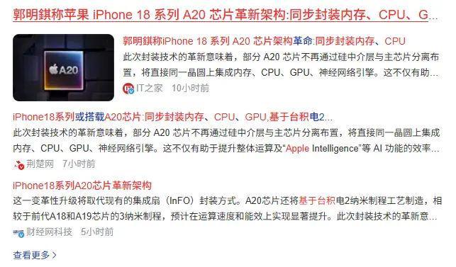 甚至郭明錤此前的爆料曾表明,2026年下半年将率先推出iPhone 18 Pro和折叠屏iPhone,而较低端型号或将延期至2027年春季发布。