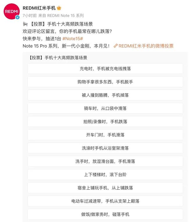 REDMI 红米手机官方还表示,“生活中的意外才是品质的真实大考”,并列出了“手机十大高频跌落场景”: