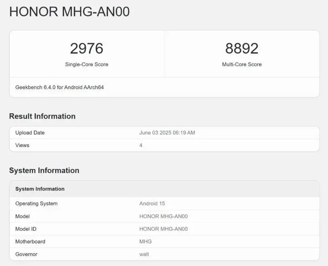 目前该机的跑分已经出现在Geekbench 6数据库,型号MHG-AN00,搭载高通骁龙8至尊领先版,成绩是单核2976分,多核8892分。
