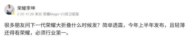 荣耀终端股份有限公司旗舰手机产品经理李坤此前发文确认,下一代荣耀大折叠今年上半年发布,轻薄“必须行业第一”。