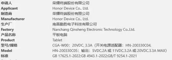 此前 , 一款 型号为 CGA-W00 的荣耀平板通过 3C 认证,相关页面显示其最高支持 66W 快充,预计为荣耀 MagicPad 3 平板。