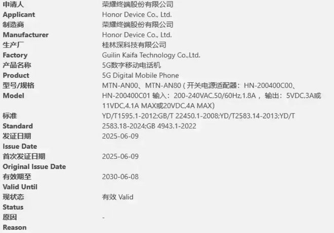 发布会前夕,一款型号为 MTN-AN00 的新荣耀手机现身中国 3C 认证平台数据库,同时公示的还有衍生机型 MTN-AN80。