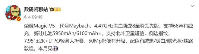 该博主表示,新机代号 Maybach,搭载4.47GHz 满血骁龙 8 至尊领先版处理器,内置5950mAh/6100mAh±新硅电池,支持66W有线充电。