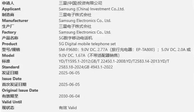 与此同时,三星首款三折叠新机的消息也来了。新机已经通过国内 3C 认证,型号为“SM-F9680”(后缀 0 代表国行版本),不带电源适配器销售,支持型号为 EP-TA800 的旅行充电器,最高支持 25W 充电。