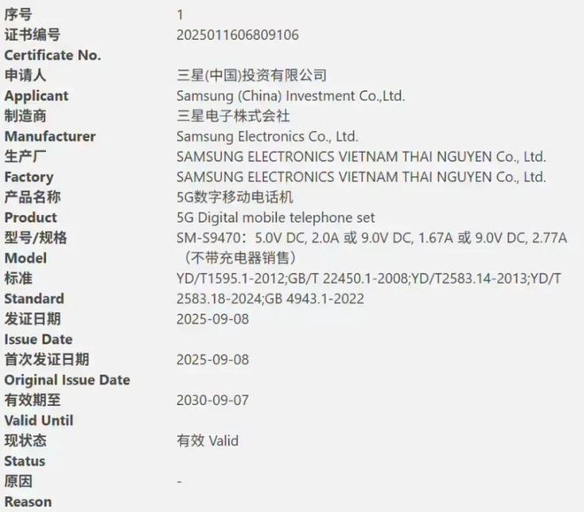 3C 认证页面显示支持 10V / 4.5A 或 15V / 3A,这与 Galaxy S25 Ultra 完全相同,显示依然支持 45W 充电。