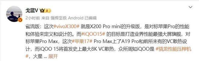 据悉,iQOO 15定位是大屏性能旗舰,iQOO产品经理戈蓝V表示,iQOO 15将在分辨率、刷新率、亮度、画质、护眼、功耗等全面超越苹果iPhone 17 Pro Max。