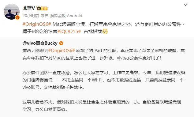 系统方面,新机首批搭载OriginOS 6,支持Mac跨端随心传——不用连接同一个Wi-Fi,也不用数据线连接,只要两端登录同一个vivo账号,文件就能随手跨端传。