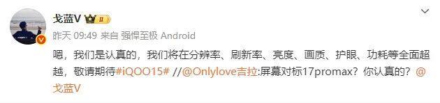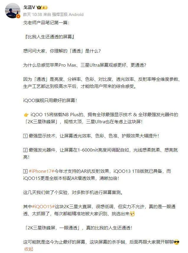iQOO 产品经理@戈蓝V 昨日发文称,iQOO 15 将搭载拥有全球最强显示技术 & 全球最强发光器件的“2K 三星珠峰屏”。