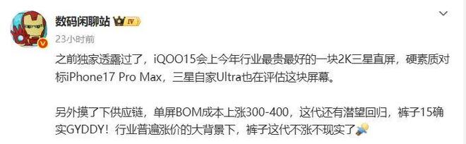 由此来看,iQOO 15的售价可能会上涨,感兴趣的朋友可以保持关注。