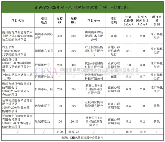 2.53GWh,拟引资19.9亿元,山西2025第三批民间资本推介项目发布