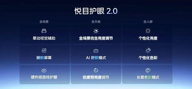 护眼方面,去除偏光层的屏幕光更接近自然光,结合 1nit 暗光亮度与全新硬件级游戏护眼术,以及悦目护眼 2.0,获得了莱茵无偏振显示认证和莱茵游戏护眼认证。