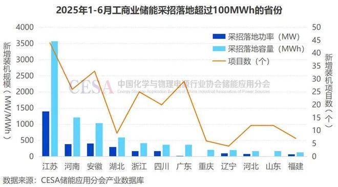 其中,不管数量还是规模,江苏都遥遥领先,采招落地规模达1.4GW/3.57GWh,超过全国采招落地总规模的四成。河南、安徽采招落地规模均超1GWh,分别位居全国第二、第三。