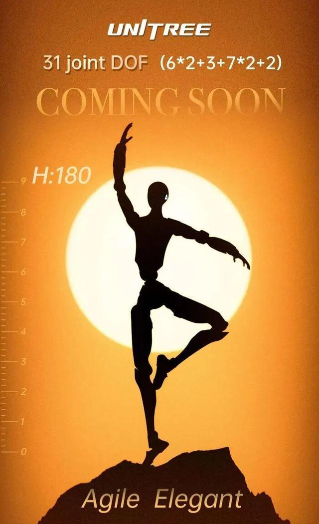 今年8月19日,宇树科技曾发布新款人形机器人预告海报,配文“敬请期待”。根据官方海报,新款人形机器人身高1.8米,将配备31个关节,这意味着机器人或具有更好的灵活性和动作精准度。
