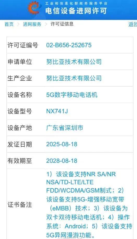 日前,一款型号为“NX741J”努比亚新机在工信部入网,相关页面显示该设备支持 NR SA / NR NSA / TD-LTE / LTE FDD / WCDMA / GSM 制式、支持 5G-增强移动宽带(eMBB)技术、支持 5G 异网漫游功能等。