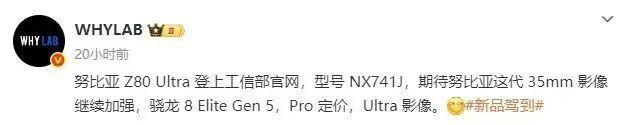 据博主@WHYLAB 发文透露,新机为努比亚 Z80 Ultra,这代 35mm 影像将继续加强,搭载骁龙 8 Elite Gen5 处理器,采取 Pro 定价 + Ultra 影像的策略。