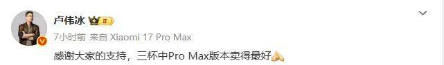 此外,卢伟冰还发文介绍称,三款机型中Pro Max版本卖得最好。