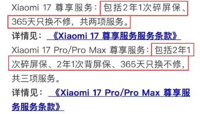 另据相关媒体介绍称,小米官方赠送的首发尊享服务在今年有所调整,取消了上代赠送的电池保,仅包含2年1次的碎屏保,Pro系列独占的2年1次的背屏保和全系365天的只换不修,购买首发小米17系列新机的小伙伴需要了解一下。