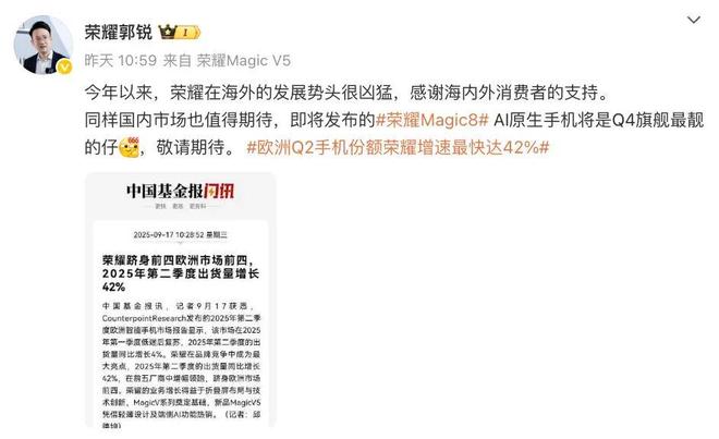 今年以来,荣耀在海外的发展势头很凶猛,感谢海内外消费者的支持。同样国内市场也值得期待,即将发布的荣耀Magic8 AI原生手机将是Q4旗舰最靓的仔,敬请期待。